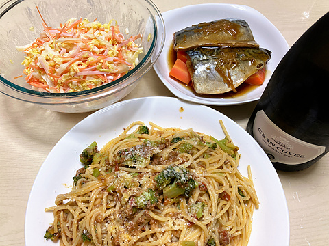 本日のメニューは、上段左から白菜のコールスロー、サバの生姜煮、下段が自家製ミートソースパスタ、です。