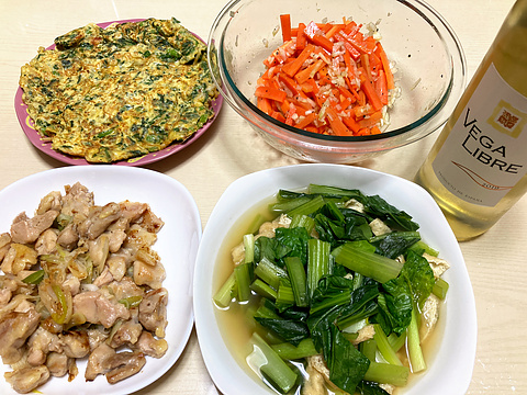 本日のメニューは、上段左から春菊とパスタのオムレツ、レンチンにんじんのオリーブオイルサラダ、下段左から焼き鳥とネギの塩焼き、油揚げと小松菜の煮浸し、です。