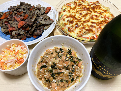 本日のメニューは、上段左から鶏レバーとレンコンの黒ゴマきんぴら、残り物にんじんグラタン、下段左から白菜のコールスローサラダ、ネギとろサーモンと納豆のなめ茸和え、です。