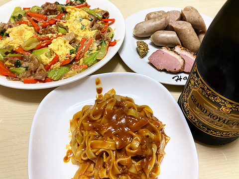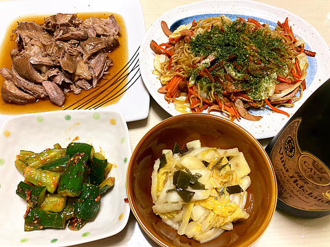 本日のメニューは、上段左から自家製煮豚、ソース焼きそば、下段左からきゅうりの辛みそ和え、白菜漬けのナムル、です。