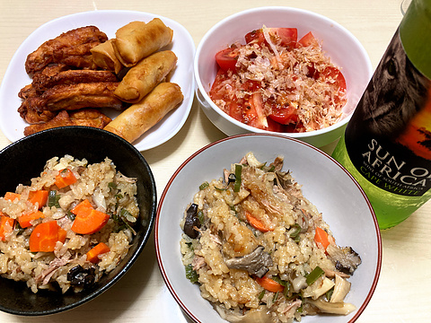 本日のメニューは、上段左からチキンバーと春巻き(冷凍品を揚げたもの)、トマトのおかかサラダ、下段が煮豚の中華おこわ、です。