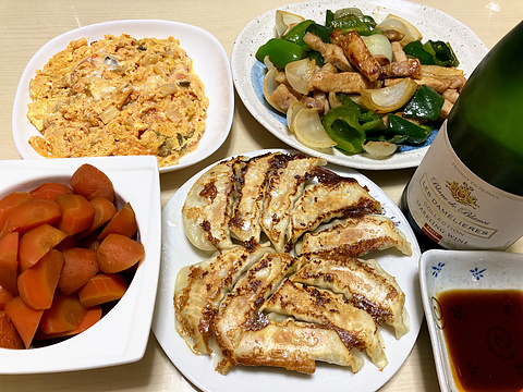 本日のメニューは、上段左からキムチチーズ玉子炒め、塩麹豚の玉ねぎピーマン炒め、下段左からにんじんのしょう油煮、焼き餃子(冷凍品を焼いたもの)、です。
