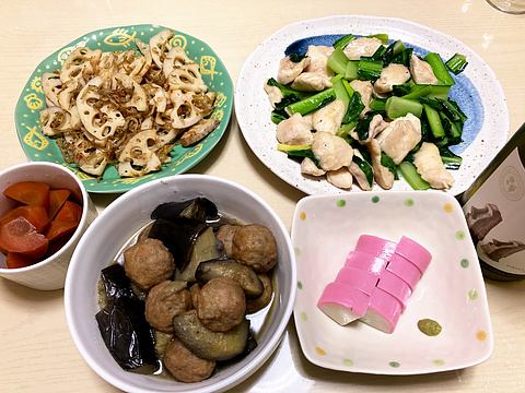 本日のメニューは、上段左からレンコンのじゃこ炒め、鶏胸肉と小松菜の塩炒め、下段左からにんじんのしょう油煮、肉団子とナスのコンソメ煮、板わさ、です。