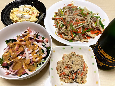 本日のメニューは、上段左から玉子マカロニサラダ(市販品)、豚ガツ野菜炒め、下段左からイカとワカメの辛子酢みそ和え、卯の花、です。