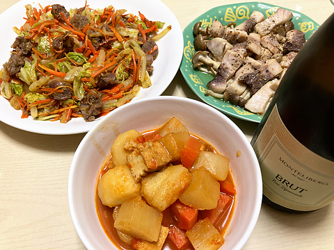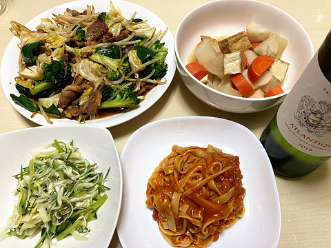 本日のメニューは、上段左から牛カルビの焼き肉、厚揚げと根菜の煮物、下段左からネギのナムル、カニとトマトのクリームパスタ、です。