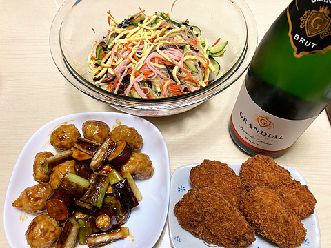 本日のメニューは、上段が春雨の中華サラダ、下段左から鶏つくねとネギとさつまいもの照り焼き、マグロカツ(市販品を揚げたもの)、です。