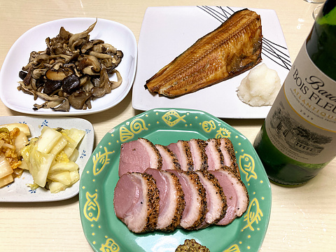 本日のメニューは、上段左からきのこのバターソテー、ほっけの味醂干し、下段左から白菜漬け2種、鴨のパストラミ(市販品)、です。