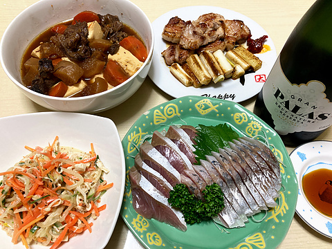 本日のメニューは、上段左から牛すじ豆腐、豚肩ロースとねぎのソテー&辛みそ添え、下段左から自家製サラダ鶏のサラダ、イナダとアジの刺身、です。