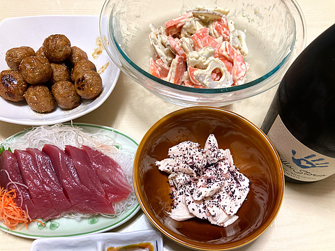 本日のメニューは、上段左から鶏団子の照り焼き、レンコンとにんじんのクリームチーズ和え、下段左からカツオの刺身、自家製サラダチキンのゆかり和え、です。