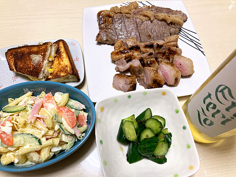 本日のメニューは、上段左からクロックムッシュ(市販品)、牛肉と豚肉の塩麹漬け焼き、下段左からマカロニサラダ、きゅうりの梅漬け、です。