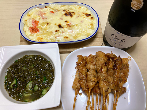 本日のメニューは、上段がマカロニサラダグラタン、下段左からもずく酢、焼き鳥(市販品を焼いたもの)、です。