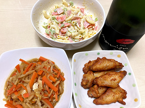 本日のメニューは、上段がマカロニサラダ、下段左から切り干し大根の煮物、チキンバー(市販品を揚げたもの)、です。