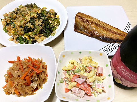 本日のメニューは、上段左から鮭レタスチャーハン、ほっけのみりん干し、下段左から切り干し大根の煮物、マカロニサラダ、です。