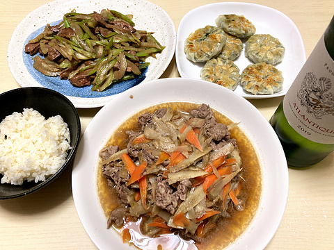 本日のメニューは、上段左から鶏レバーとセロリの塩炒め、ニラまんじゅう(市販品を焼いたもの)、下段左から新米のご飯、牛肉とごぼうの時雨煮、です。
