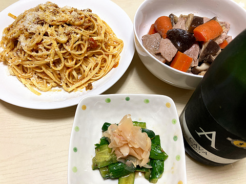 本日のメニューは、上段左から自家製ミートソースパスタ、豚カルビとにんじんとしいたけの煮物、下段がきゅうりの中華漬けと新しょうがの酢漬け、です。