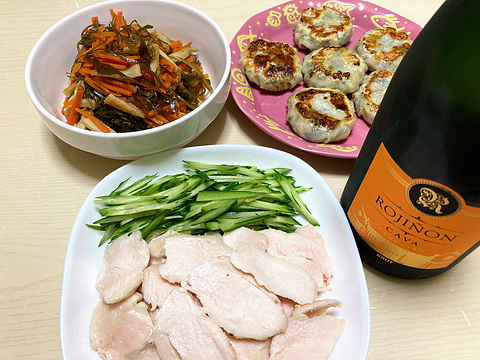 本日のメニューは、上段左から昆布とにんじんの煮物、ニラまんじゅう(市販品を焼いたもの)、下段が自家製サラダチキン、です。
