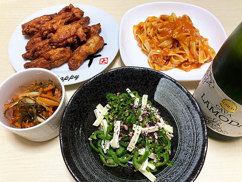 本日のメニューは、上段左からチキンバー(冷凍品を揚げたもの)、カニトマトソースパスタ、下段左から昆布とにんじんの煮物、チータラとピーマンのゆかり和え、です。