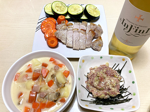 本日のメニューは、上段が豚ロースの塩麹漬け焼き、下段左からクラムチャウダー、変わりネギトロ、です。