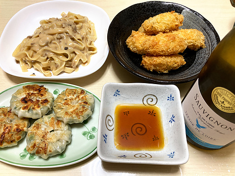 本日のメニューは、上段左からきのこクリームパスタ、カキフライ(冷凍品を揚げたもの)、下段がニラまん(冷凍品を焼いたもの)、です。
