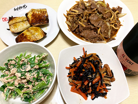 本日のメニューは、上段左から塩サバのカレー焼き、牛肉とヒラタケのタレ炒め、下段左からつる菜のツナ和え、ひじきの煮物、です。