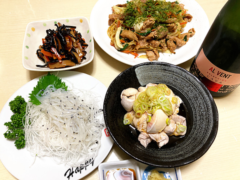 本日のメニューは、上段左からひじき煮、ソース焼きそば、下段左から白魚の刺身、白子ポン酢、です。
