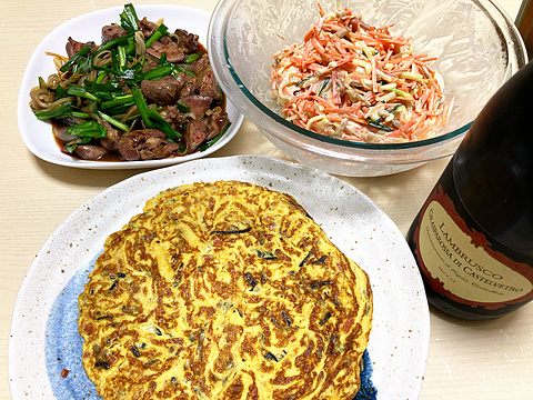 本日のメニューは、上段左からニラレバ、にんじんとズッキーニのザーサイクリームチーズ和え、下段がひじき煮の卵焼き、です。