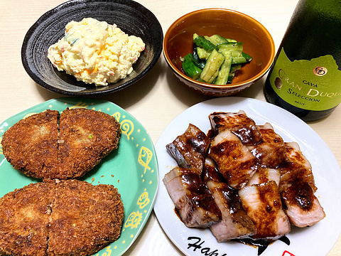 本日のメニューは、上段左から玉子ポテマカサラダ(市販品)、たたききゅうりの中華漬け、下段左から手作りキャベツメンチ、低温調理の焼き豚、です。