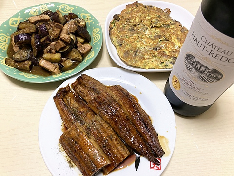 本日のメニューは、上段左から豚角煮とナスの炒め物、オムそば、下段がうなぎの蒲焼き、です。