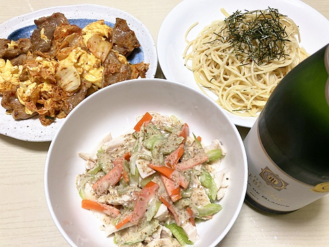 本日のメニューは、上段左から豚キムチ玉子炒め、たらこスパゲッティ、下段が自家製サラダチキンとセロリとにんじんのサラダ、です。