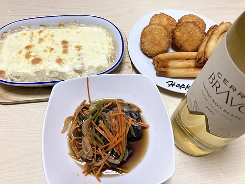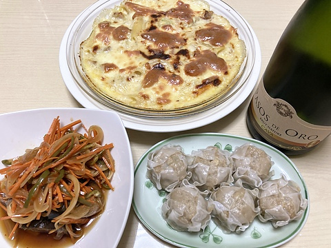 本日のメニューは、上段がペンネグラタン、下段左からナスの南蛮漬け、シュウマイ、です。