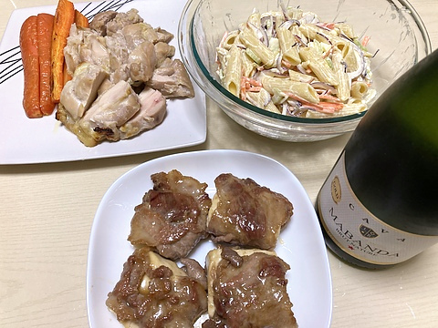 本日のメニューは、上段左から鶏もも肉の塩漬け漬け焼き、ペンネのサラダ、下段が豆腐の豚肉巻き、です。