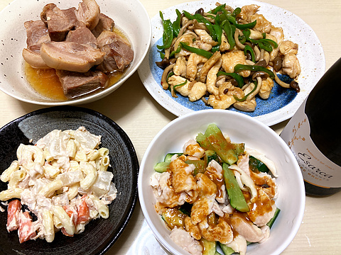 本日のメニューは、上段左から豚のビール角煮、鶏胸肉としめじとピーマンのオイスターソース炒め、下段左からにんじんと冬瓜のマカロニサラダ、鶏皮とたたききゅうりのごまみそ和え、です。