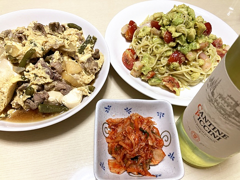 本日のメニューは、上段左から肉豆腐の玉子とじ、海老とトマトとアボカドの冷製パスタ、下段がキムチ漬け(市販品)、です。