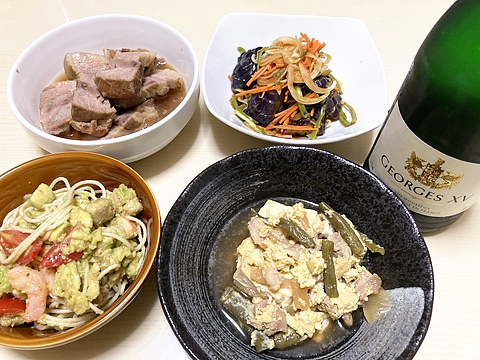本日のメニューは、上段左から豚の角煮、ナスの南蛮漬け、下段左から海老とトマトとアボカドの冷製パスタ、肉豆腐の玉子とじ、です。