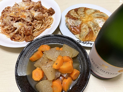 本日のメニューは、上段左から自家製トマトソースの豚角煮入りパスタ、チーズ焼き餃子、下段が冬瓜とにんじんの中華煮、です。