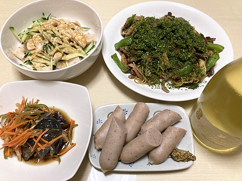 本日のメニューは、上段左から自家製サラダチキンときゅうりのごまみそマヨ和え、きのこたっぷりソース焼きそば、下段左からナスの南蛮漬け、レモンとペッパーのソーセージ、です。