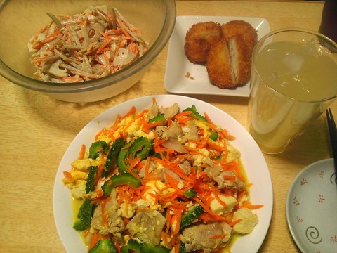 本日のメニューは、ゴーヤチャンプル、根菜の胡麻サラダ、海老カツ、です。