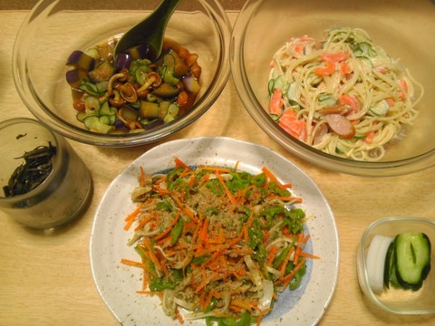 パスタのサラダ、ミミガー炒め、ナスとなめこの生姜ポン酢和え