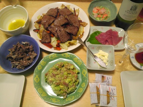 本日のメニューは、常陸牛と野菜のソテー・マスタードソース、アボガドとマグロのタルタル、砂肝のコンフィ風、いぶりがっこのクリームチーズ添え、マグロの刺身、です。