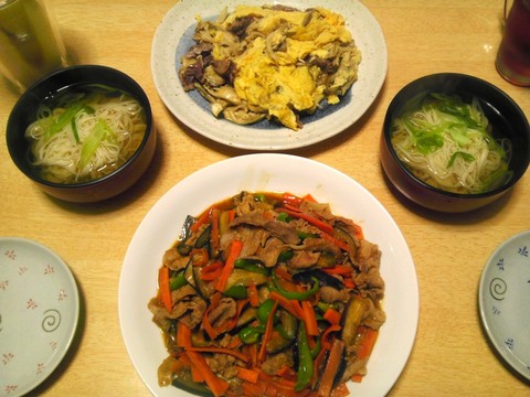 本日のメニューは、舞茸と玉子の炒め物、麻婆茄子、そうめん、です。