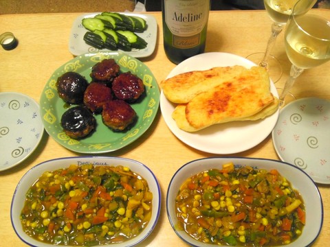 本日のメニューは、野菜たっぷりシーフードカレー、オーブン焼きナン、しいたけの肉詰め、キュウリのぬか漬け、です。