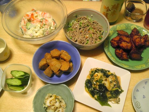 本日のメニューは、ポテトサラダ、里芋の煮っころがし、鶏の唐揚げ、蕎麦のオクラ納豆和え、つぶ貝の酢味噌和え、つぶ貝の醤油和え、です。