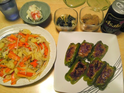 本日のメニューは、ピーマンの肉詰め、もやしとにんじんのつぶ貝炒め、昨日の残り物、です。