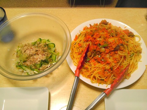 本日のメニューは、トマトソースパスタ、冷蔵庫の干からびる寸前の野菜を使った残り物一掃サラダ、です。