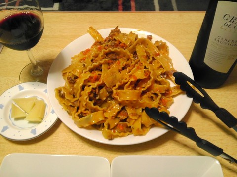 イタリアで買ってきた幅広のパスタで、マンフレディーネと袋に書いてありました。