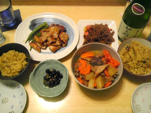 本日のメニューは、豚肉とエリンギとオクラの焼き物、もつ煮、カレー炊き込みご飯、浸し豆、昨日の残り物、です。