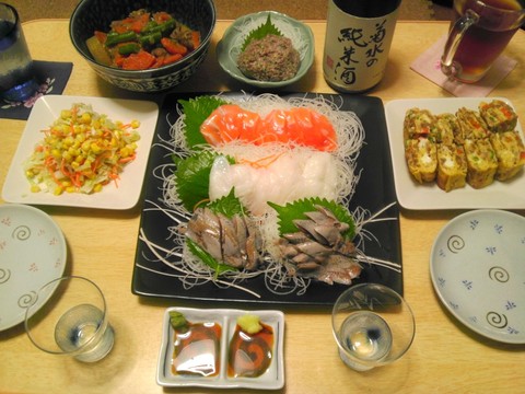 刺身、コールスローサラダ、肉味噌の玉子焼き、他