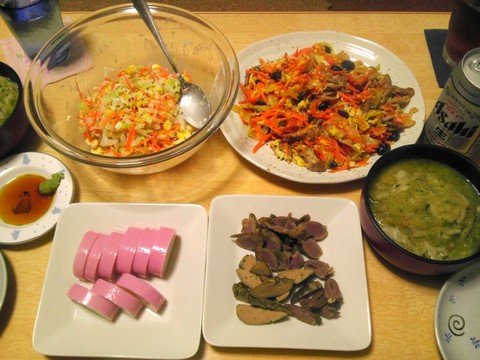 本日のメニューは、にんじんチャンプルー、コールスローサラダ、餃子のみぞれスープ、板わさ、レバーと砂肝のくん製、です。