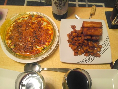 ナスのグラタン、軟骨の唐揚げ、チーズ春巻き