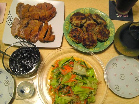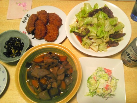本日のメニューは、ハラミとキャベツの炒め物、五目煮、浸し豆、あとは買ってきたお惣菜の海老カツとポテトサラダ、です。